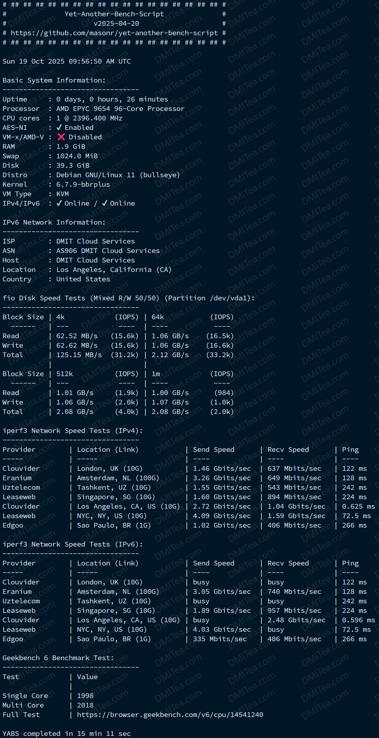六、yabs测试,CPU得分非常的高,单核1,998!